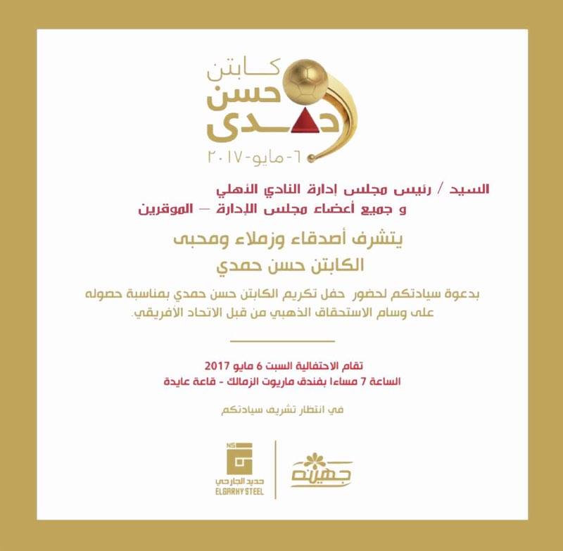 وجه محبو وأصدقاء حسن حمدي الدعوة لمجلس إداراة النادي الأهلي الحالي برئاسة المهندس محمود طاهر لحضور حفل تكريم حسن حمدي رئيس النادي السابق لحصوله علي وسام الإستحقاق الذهبي كأفضل رئيس نادٍ من الاتحاد الافريقى «كاف»، وذلك السبت المقبل بأحد فنادق حي الزمالك.