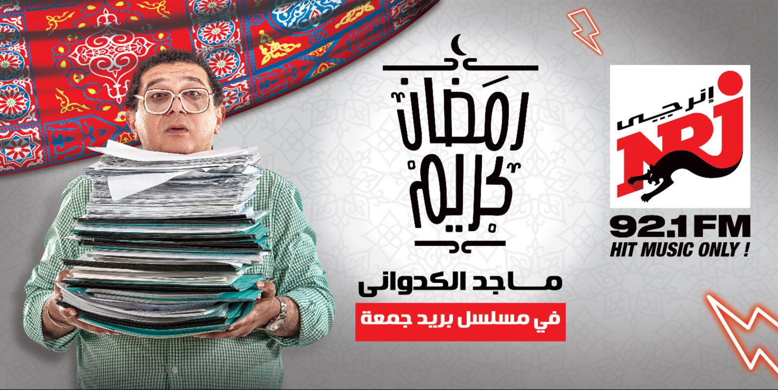 يطل الفنان ماجد الكدواني أمام ميكروفون إذاعة انرجي في مسلسل "بريد جمعة"، حيث ظهر الكدواني على البوستر التشويقي الخاص به، وهو يحمل عددًا من الصحف، بينما تخبر ملابسه ونظارته عن شخصيته.