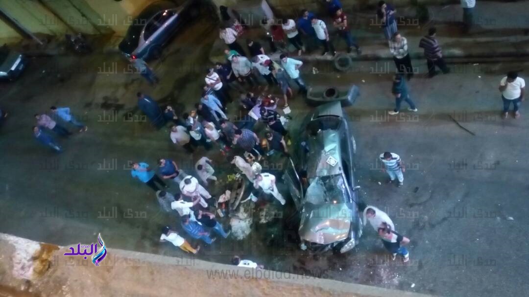 إصابة شخصين في حادث انقلاب سيارة أعلى كوبري أكتوبر.. صور