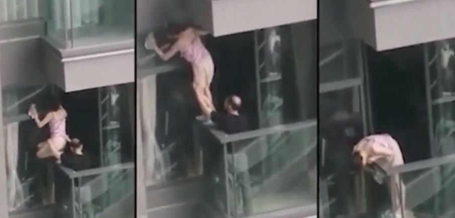 ربة منزل تعرض نفسها للخطر من أجل تلميع زجاج البلكونة .. فيديو