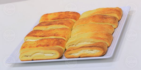 * تترك العجينة لتتخمر ثم تفرد بالنشابة مع تعفيرة دقيق وتحشى بالجبنة وتطبق الأطراف ويقطع ثم يرص فى صينية