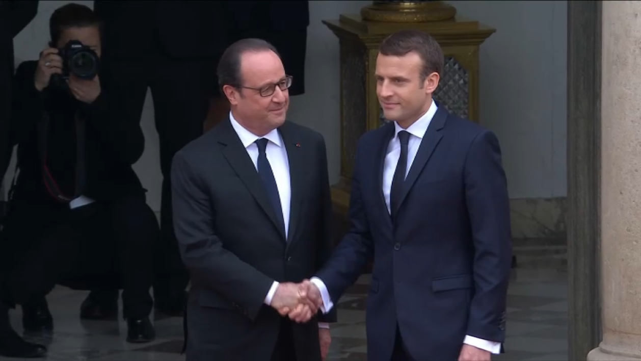 وصل الرئيس الفرنسي الجديد إيمانويل ماكرون إلى قصر الإليزيه، حيث كان في استقباله الرئيس المنتهية ولايته فرانسوا أولاند، وذلك لاستلام السلطة منه.