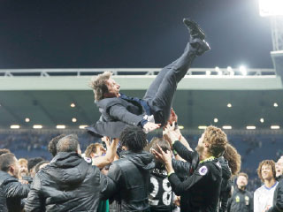 حمل لاعبو تشيلسي مدربهم أنطونيو كونتي بعد لحظات من الفوز 1/ صفر على وست بروميتش ألبيون وإحراز لقب الدوري الإنجليزي الممتاز أمس الأول، لكن بمجرد أن استقر المدرب الإيطالي أرضًا بدأ التفكير في الخطوة المقبلة وهي الجمع بين الثنائية المحلية.