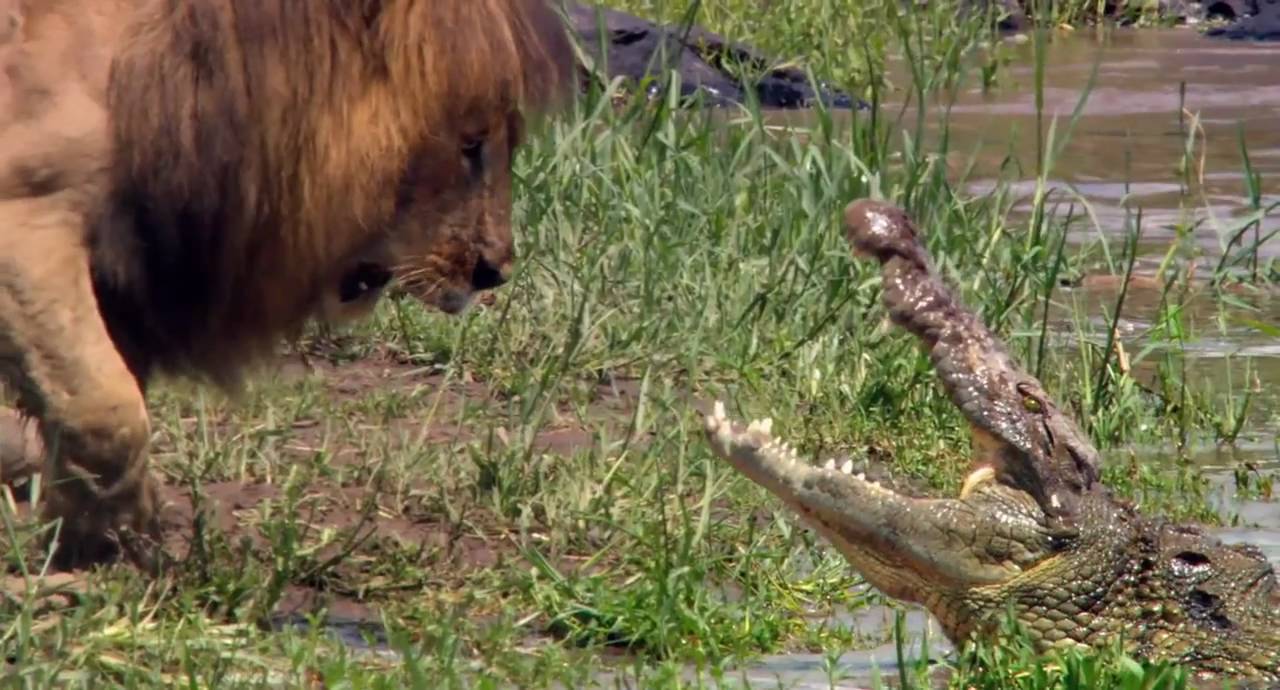 شاهد.. مواجهة بين أسدين وتمساح عملاق تنتهي بشكل غير متوقع