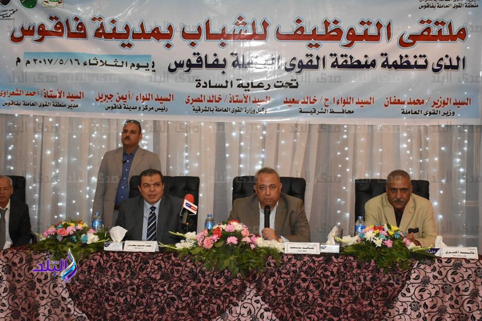 افتتح الدكتور محمد سعفان وزير القوي العاملة، واللواء خالد سعيد محافظ الشرقية ملتقي التوظيف للشباب بمدينة فاقوس والذي تنظمه محافظة الشرقية بالتعاون مع مديرية القوى العاملة ومديرية الشباب والرياضة والصندوق الاجتماعي للتنمية وبرنامج مشروعك.