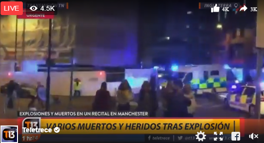 وأظهر فيديو نشر على يوتيوب أفرادا من الجمهور يصرخون ويركضون في المكان. وتم إغلاق المنطقة المحيطة بقاعة "مانشستر أرينا" و الشرطة تتعامل مع حادثة في المكان. كما توقفت رحلات القطارات أيضا في محطة فكتوريا مانشستر وتم إخلاؤها من المسافرين.