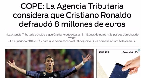 أفادت صحيفة سبورت الإسبانية، أن مصلحة الضرائب أعلنت تهرب رونالدو بدفع مبلغ 8 مليون يورو على الفترة ما بين 2011 وحتي 2014.
