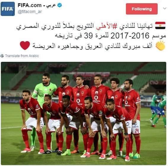 وكتب صفحة الفيفا عبر موقع التواصل الإجتماعي "تويتر" قائلة: "تهانينا للنادي #الأهلي التتويج بطلًا للدوري المصري موسم 2016-2017 للمرة 39 في تاريخه، ألف مبروك للنادي العريق وجماهيره العريضة".