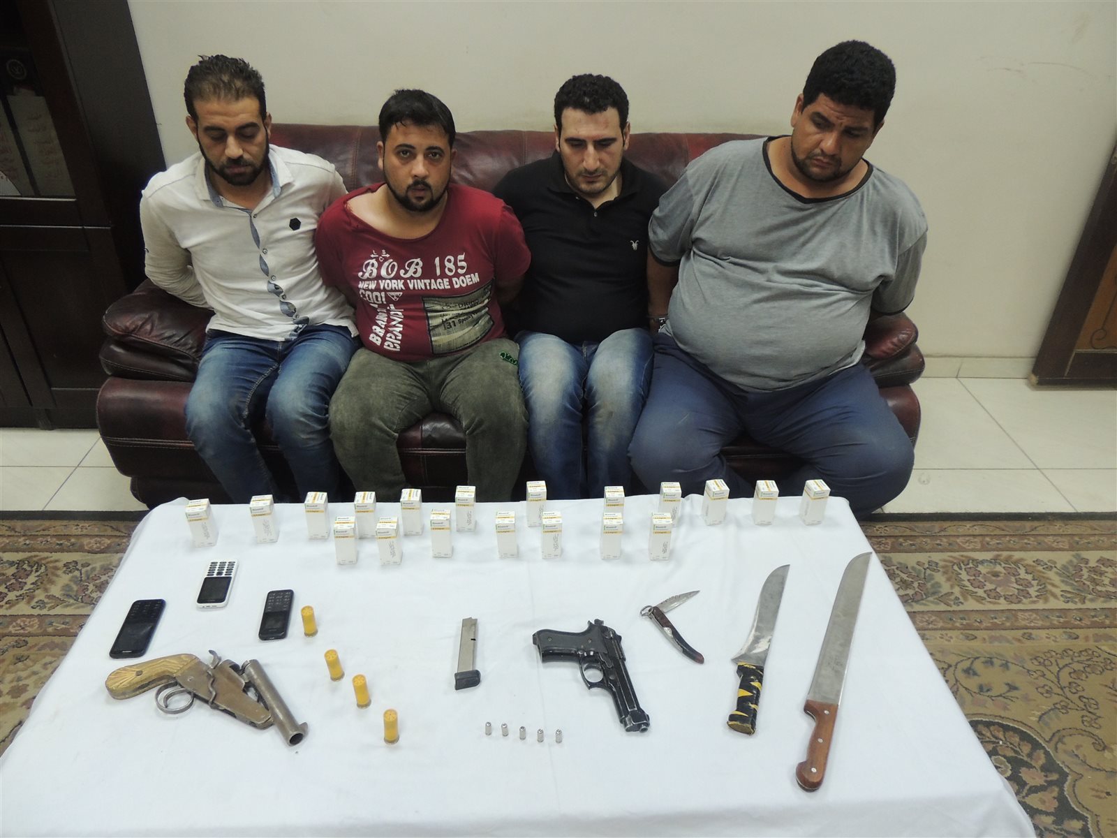 تم بإرشاد المتهم ضبطهم ماعدا احدهم هارب وبصحبتهم المجني عليه , وضبط بحوزتهم على فرد خرطوش و4 طلقات و طبنجة صوت و 3 سلاح ابيض و 19 علية ريفوتريل نقط المخدر .
