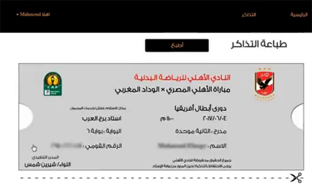 وفيما يلي فيديو لطريقة طباعة تذكرة مباراة الأهلي والوداد، وذلك لاستخدام النسخة المطبوعة في معرفة بيانات صاحب التذكرة عند دخول ملعب برج العرب.