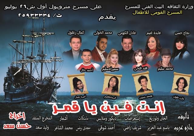 قال الفنان حسن يوسف مدير فرقة المسرح القومى للأطفال أن الفرقة تقدم حاليا العرض المسرحي "أنت فين ياقمر " على مسرح متروبول (عبدالمنعم مدبولي) و ذلك حتى ٢٠ رمضان الموافق ١٥ يونيو، يوميا فى تمام التاسعة مساء.