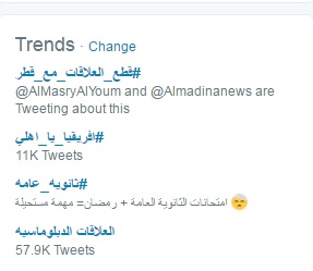 تصدر هاشتاج "#قطع_العلاقات_مع_قطر" موقع التواصل الاجتماعي "تويتر"، وذلك بعد دقائق من إعلان مصر والسعودية والإمارات والبحرين، فجر اليوم الاثنين، قطع علاقاتها الدبلوماسية بقطر، وأخذت قرارات متفرقة بشأن منع سفر مواطنيها إلى قطر، أو إغلاق المجال البحري والجوي أمام الطائرات والبواخر القطرية.