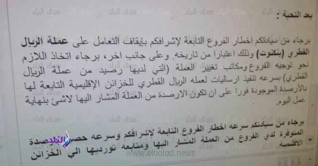 صرحت مصادر مصرفية بمطار القاهرة : تلقت فروع البنوك العاملة بمطار القاهرة إخطارا من البنك المركزى كان تم إرساله للبنوك الرئيسية يتضمن إيقاف التعامل على عملة الريال القطرى إعتبارا من تاريخه مع توجيه الفروع ومكاتب تغيير العملة التى لديها رصيد من العملة القطرية بسرعة إرسالها إلى الخزائن الإقليمية التابعة لها بالأرصدة الموجودة بحيث لاتوجد أية أرصدة فى نهاية اليوم الإثنين ..