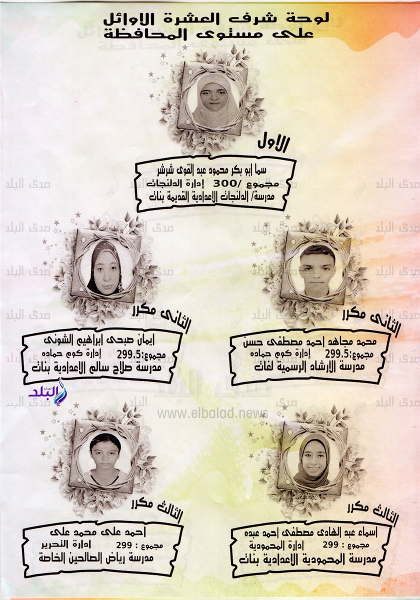 ينشر موقع "صدى البلد"الإخباريصور الطلاب العشر الأوائل في الشهادةالإعداديةللعام الدراسي 2016 /2017 بمحافظة البحيرة.