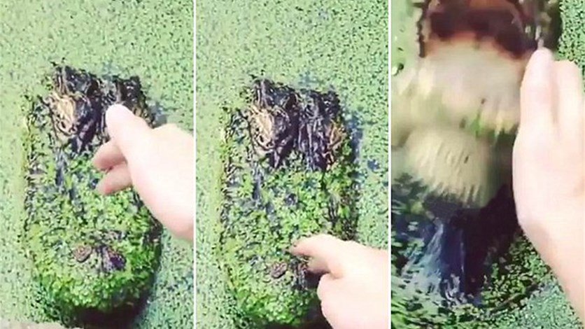 بينما ظل التمساح مستقرًا في بحيرة تشارلز بـ"لويزيانا"، ويتحرك فى أقل من ثانية محاولًا الانقضاض على يد هذا الشخص والتهامها عقابًا له على إزعاجه.