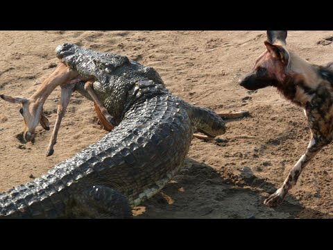 نشر موقع "لايف ليك" المعني بمقاطع الفيديو النادرة والمميزة مقطع فيديو صادمًا يظهر تمساحًا ضخمًا، بعد ما خرج من البحيرة مُتسللًا من خلال الحصول على وجبة جاهزة "غزالة" بحوذة كلاب برية مفترسة.