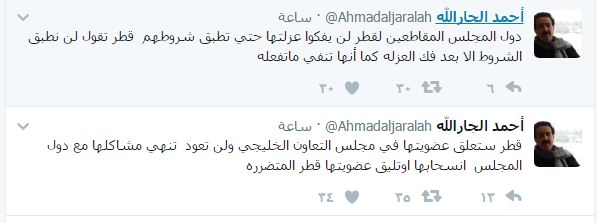 نشر رئيس تحرير صحيفة السياسة الكويتية، أحمد الجارالله، الخميس، عبر حسابه بموقع تويتر، عدة تغريدات عن المقاطعة التي تعيشها قطر، وقال: "قطر ستعلق عضويتها في مجلس التعاون الخليجي ، وانسحابها او تعليق عضويتها في النهاية قطر المتضررة".