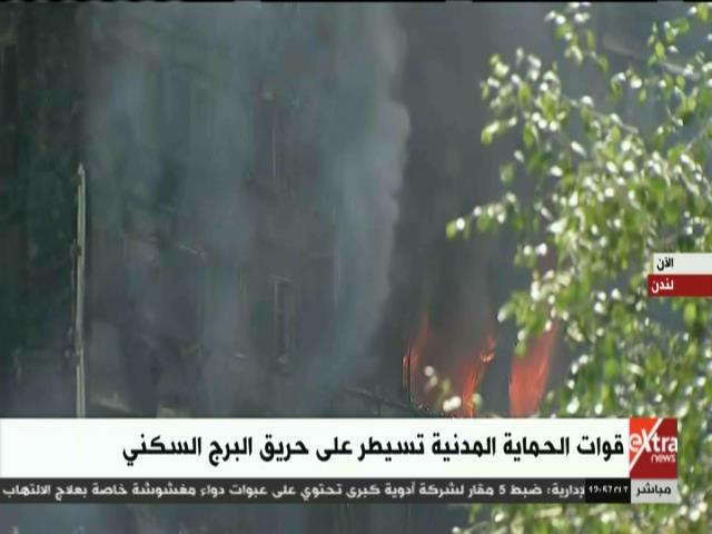 عرضت فضائية "إكسترا نيوز" اليوم الأربعاء، لقطات حية ومباشرة من العاصمة البريطانية لندن،لرصد محاولات قوات الحماية المدنية البريطانية لإخماد لحريق الهائل الذي نشب في برج سكني غرب لندن.