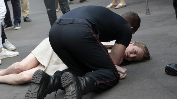 وظهرت السياسية البارزة وهي ممددة على الرصيف ورجل في الخمسين من العمر يرمي منشورات في وجهها.