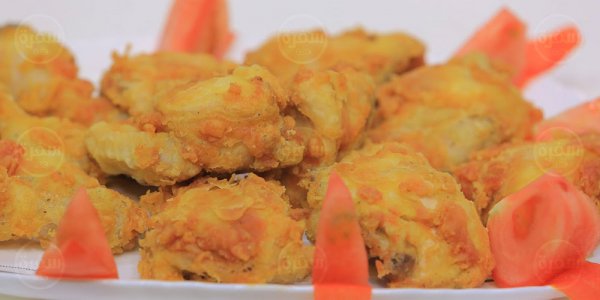 * تقلب قطع الدجاج فى الخليط ثم في الدقيق وتقلى في الزيت وتقدم
