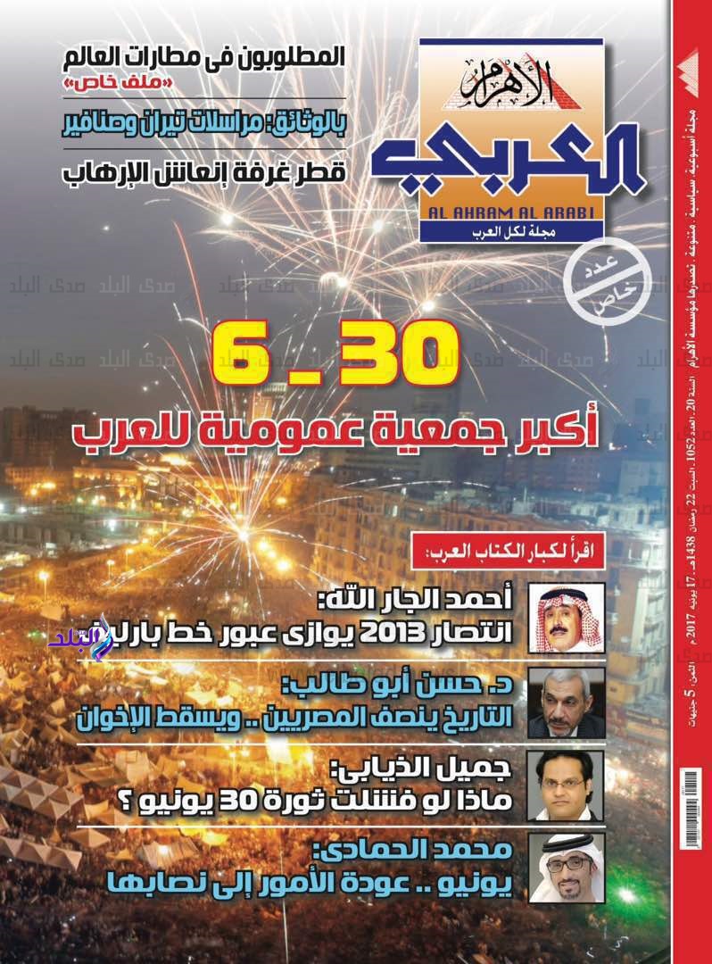 وأعدت المجلة فى عددها ملفا خاصا تحت عنوان "30-6" أكبر جمعية عمومية للعرب، تناولت فيه أحداث ثورة 30 يونيو على نظام ودورها الكبير في عزل جماعة الاخوان المسلمين الإرهابية فى مصر.
