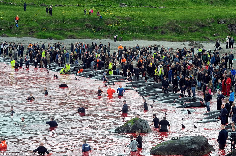 تحولت جزر فارو بالدنمارك إلى بحر من الدماء بعد قتل سكان محليون لقطيع من الحيتان الأبرياء، حيث تضطر الحيتان كل عام إلى السباحة نحو شواطئ الجزر الدنماركية أثناء هجرتها.