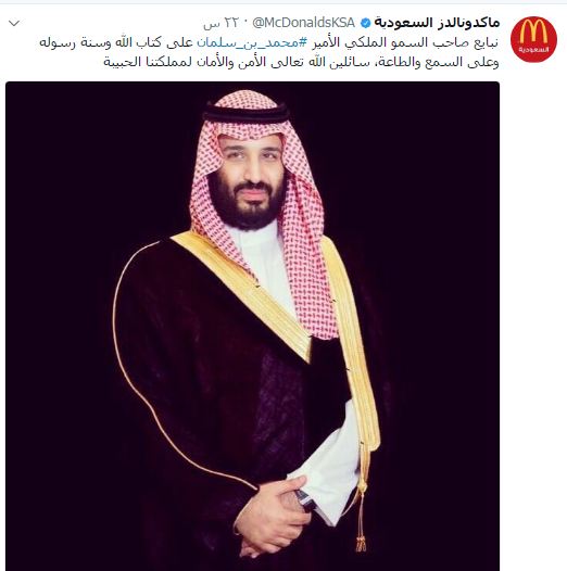 نشر حساب شركة ماكدونالدز الأمريكية، فرع السعودية، عبر حسابها بموقع تويتر مبايعة للأمير محمد بن سلمان وزير الدفاع السعودي ، بمناسبة تعيينه وليا للعهد.