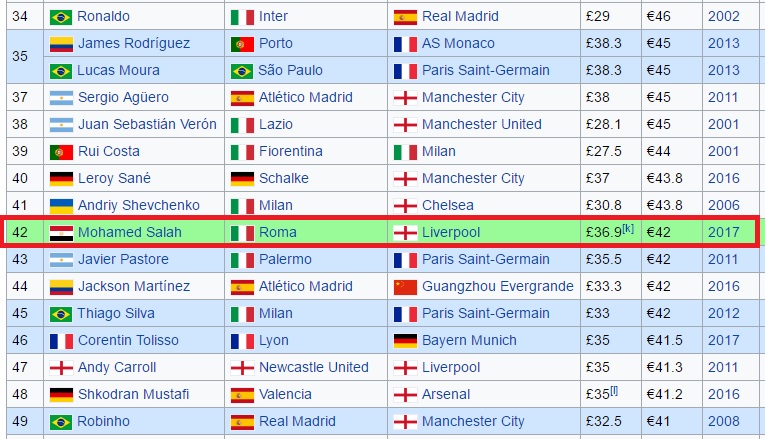 دخل النجم المصري الدولي محمد صلاح ضمن قائمة أغلى 50 لاعبا في العالم في تاريخ كرة القدم بعد انضمامه رسميا لصفوف فريق ليفربول الانجليزي مقابل 37 مليون جنيه استرليني (42 مليون يورو) بالاضافة لثمانية ملايين يورو أخرى كحوافز.