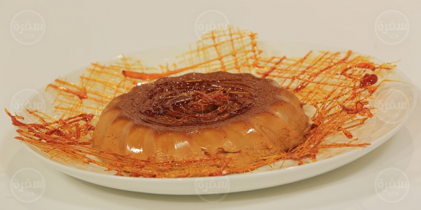 * يصب فوق الكراميل في القالب ويخبز على درجة حرارة 150 في حمام مائي من ساعة الي ساعة ونصف