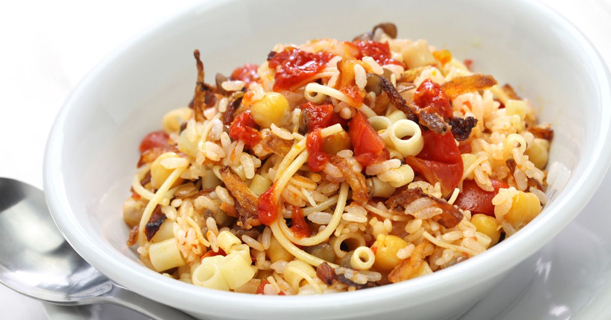 يقدم الكشري مع الدجاج المحمر والكفتة