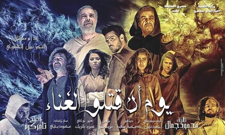 بينما عرض "يوم أن قتلوا الغناء" بطولة ياسر صادق، د. علاء قوقة ،حمادة شوشة، طارق صبرى، هند عبد الحليم، محمد ناصر، ثراء جبيل، أداء صوتى للنجم نبيل الحلفاوى، موسيقى أحمد نبيل، ديكور د. محمد سعد ،ملابس مروة منير، تعبير حركى عمرو باتريك، إخراج تامر كرم و يقدم على قاعة زكى طليمات فى تمام الساعة الثامنة مساء.
