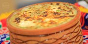 * توضع القشطة والجبنة الموتزاريلا على الوجه وتغطى وتدخل الفرن ثم تقدم