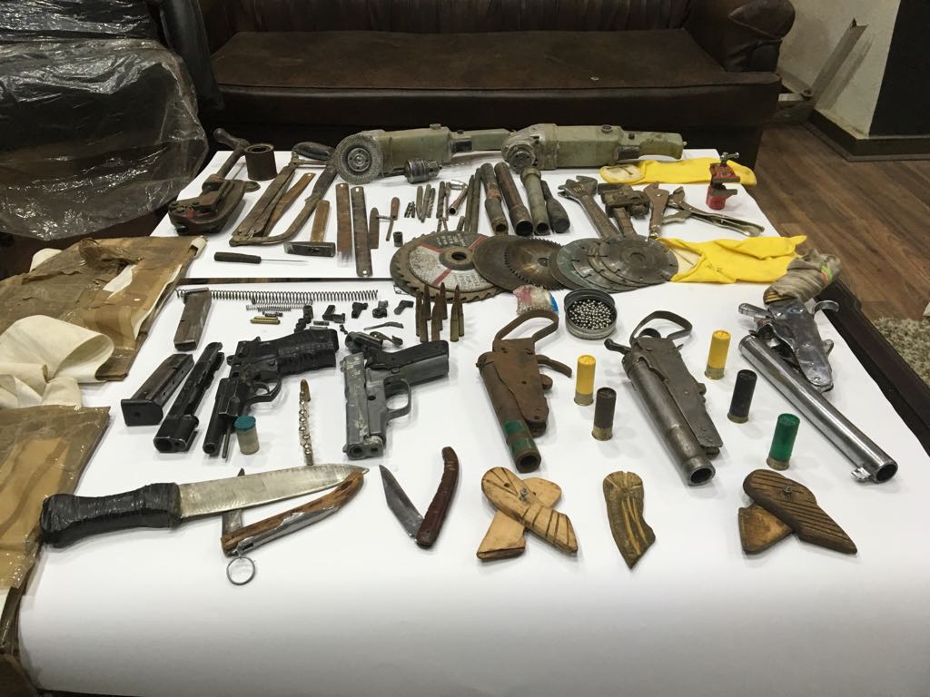 وتم ضبط المتهمين بمسكن الأول وبحوزتهما ( 8 ) قطع سلاح نارى عبارة عن بندقية خرطوش بمب اكشن مطموسة الأرقام بدون دبشك و(6 ) فرد خرطوش محلى الصنع بروح واحدة وفرد رصاص و( 68 ) طلقة خرطوش و(25) طلقة آلية ، بالإضافة إلى أدوات تصنيع عبارة عن (6 ) زرادية و( 2 ) مبرد حديدى وشاكوش وأجنة حديد وماسورة حديد ومنجلة يدوى و( 2 ) مفك وماكينة لحام وأسطوانة غاز .