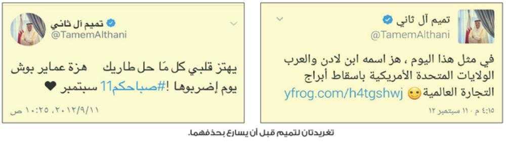 تحدثت صحيفة "عكاظ" السعودية أن تميم بن حمد آل ثاني حذف تغريدات متعاطفة مع هجمات 11 سبتمبر فى عام 2012.