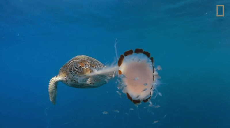 نشرت قناة "ناشونال جيوجرافيك" المختصة بالحياة البرية، مقطع فيديو نادر ومثير يظهر سلحفاة برمائية وهي تأكل "قنديل البحر" أو "الجيلي فيش" على طريقة "السباجيتي" الشهيرة.