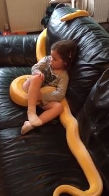 قام والدها بتصويرها، والغريب أن الطفلة ظلت جالسة فى حالة غريبة من الهدوء دون أى توتر، بينما يلتف الثعبان الضخم حولها، ويضع رأسها أعلى الأريكة.