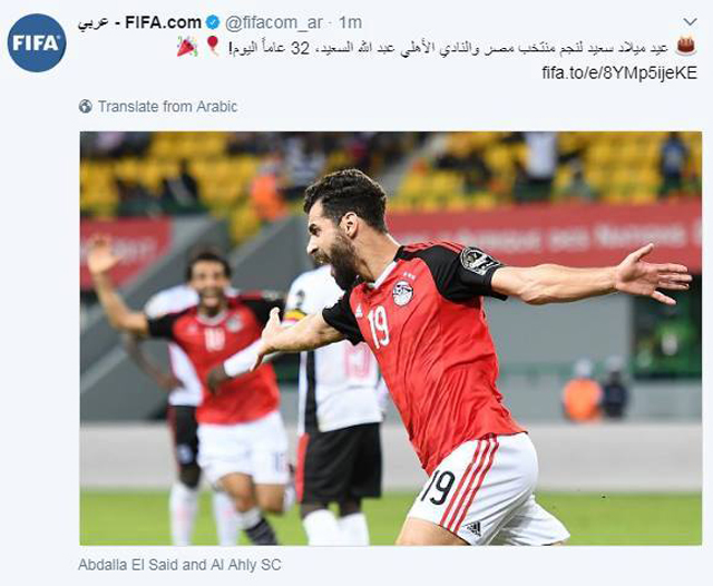 ونشر الحساب الرسمي صورة للسعيد من إحدى مباريات منتخب مصر، وعلق عليها قائلًا: ”عيد ميلاد سعيد لنجم منتخب مصر والنادي الأهلي عبد الله السعيد، 32 عامًا اليوم”.