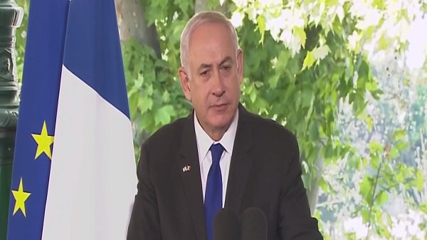 لوح رئيس الوزراء الإسرائيلي، بنيامين نتنياهو، إلى أن القدس هي عاصمة إسرائيل "الخالدة"، خلال كلمته مع الرئيس الفرنسي، إيمانويل ماكرون، خلال مشاركتهما في تخليد ذكرى حادثة "فال دي إيف".