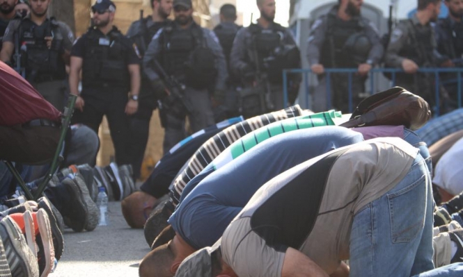 ويرابط الفلسطينيون ويقيمون صلواتهم تحت أشعة الشمس الحارقة عند مداخل بوابات المسجد الأقصى، رغم وجود قوات الاحتلال الإسرائيلي المدججة بالأسلحة.
