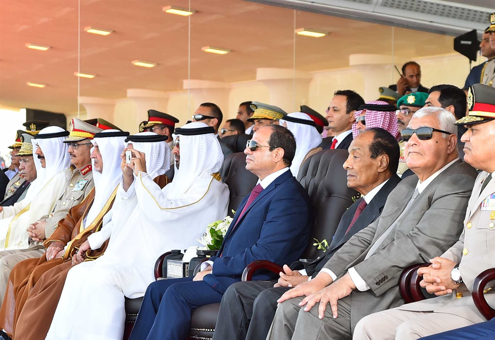 كما أتوجه بخالص التهنئة للخريجين الجدد من الدول العربية الشقيقة، والذين شاركوا أبناء مصر التعليم والتدريب والاستعداد القتالي.. نقف معًا جميعًا اليوم لنقول للعالم أجمع، أننا نتشارك في البناء وليس التدمير، في التعاون وليس التآمر، في الحفاظ على السلام وليس في بث الفرقة والنزاع بين الدول والشعوب.