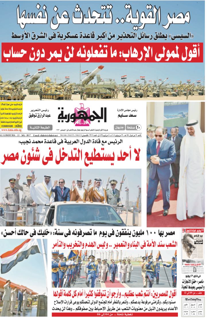 تقرأ غدا في جريدة الجمهورية في عددها الصادر صباح الأحد 23 يونيو 2017 العديد من الموضوعات الهامة في المجالات السياسية والاقتصادية والفنية والرياضية والقضائية والعالمية.