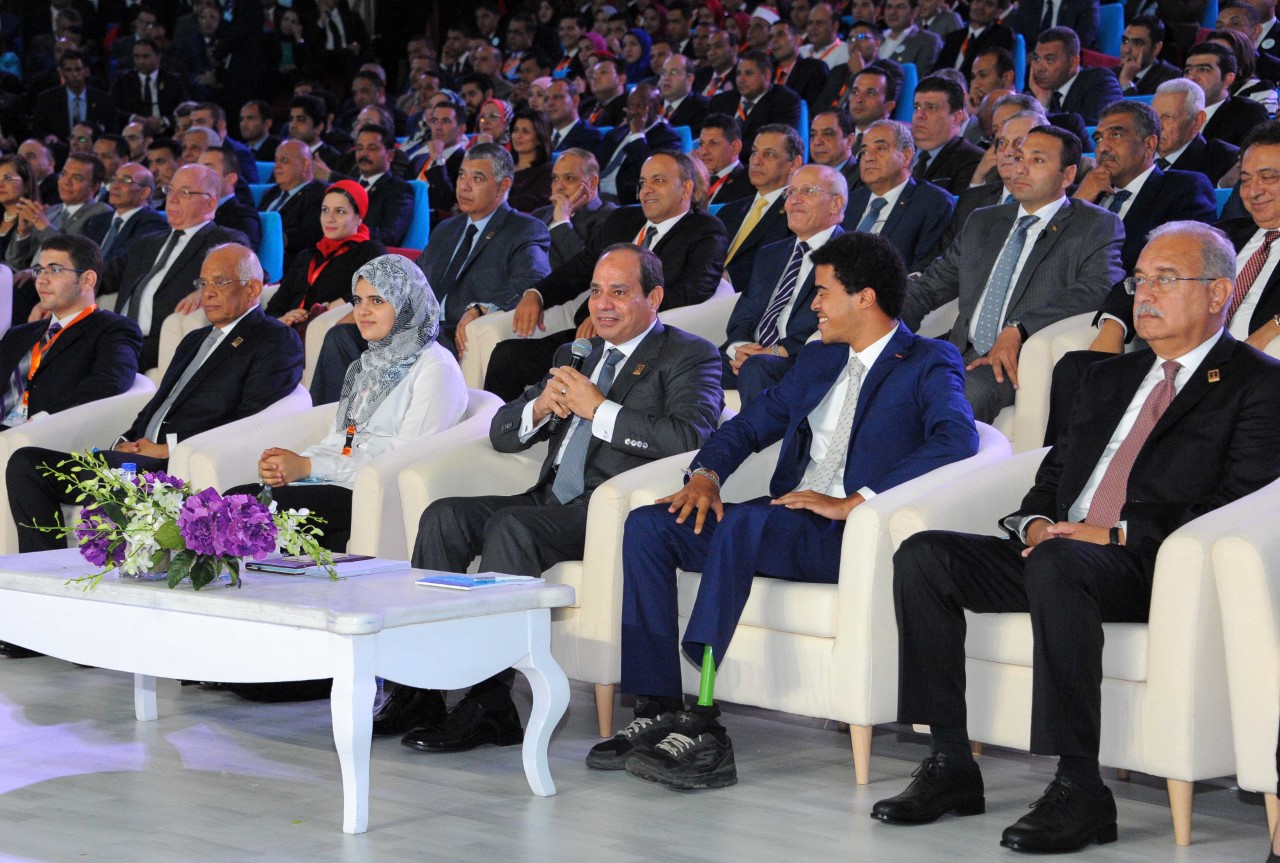 التقط الرئيس عبد الفتاح السيسي ،مجموعة من الصور التذكارية مع الشباب المشاركين فى مؤتمر الشباب الرابع المنعقد بالإسكندرية عقب إنتهاء فاعليات حفل ختام المؤتمر.