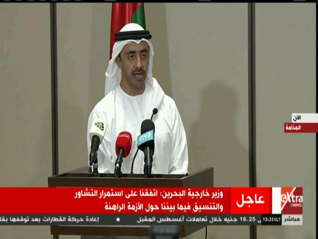 وأضاف "بن زايد"، خلال كلمته في المؤتمر الصحفي الذي عقد بين الدول الأربعة المكافحة للإرهاب بالمنامة، أنه مع الأسف فإن بعض الخطوات كان لها بعض الانعكاسات على المواطن القطري، لكن المسئولية السياسية تقع على الدولة القطرية، فهي تستطيع أن تعمل في محيطها العربي بسهولة ويسر.