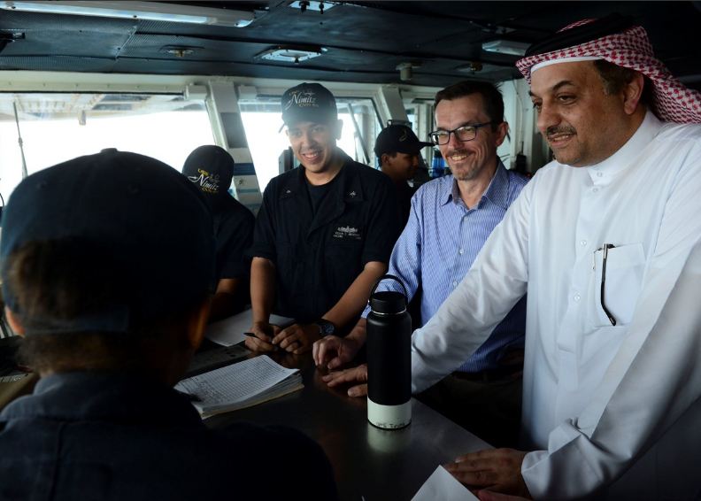 وزير دفاع قطر يزور حاملة طائرات أمريكية لكسب التأييد الدولي.. صور