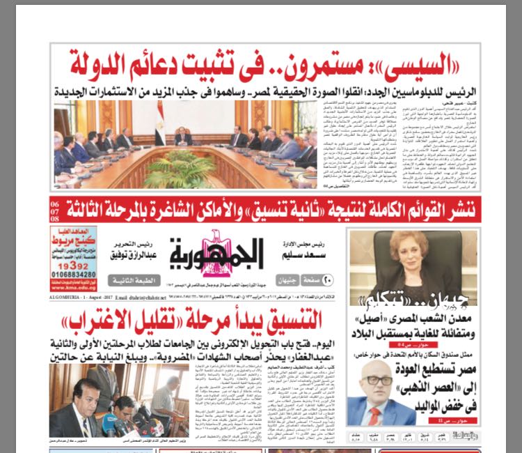 تقرأ غدا فى جريدة الجمهورية التي يرأس تحريرها الكاتب الصحفي "عبد الرازق توفيق" فى عددها الصادر صباح الثلاثاء 1 اغسطس 2017 العديد من الموضوعات الهامة فى المجالات السياسية والاقتصادية والتعليمية والفنية و الرياضية و القضائية والعالمية .