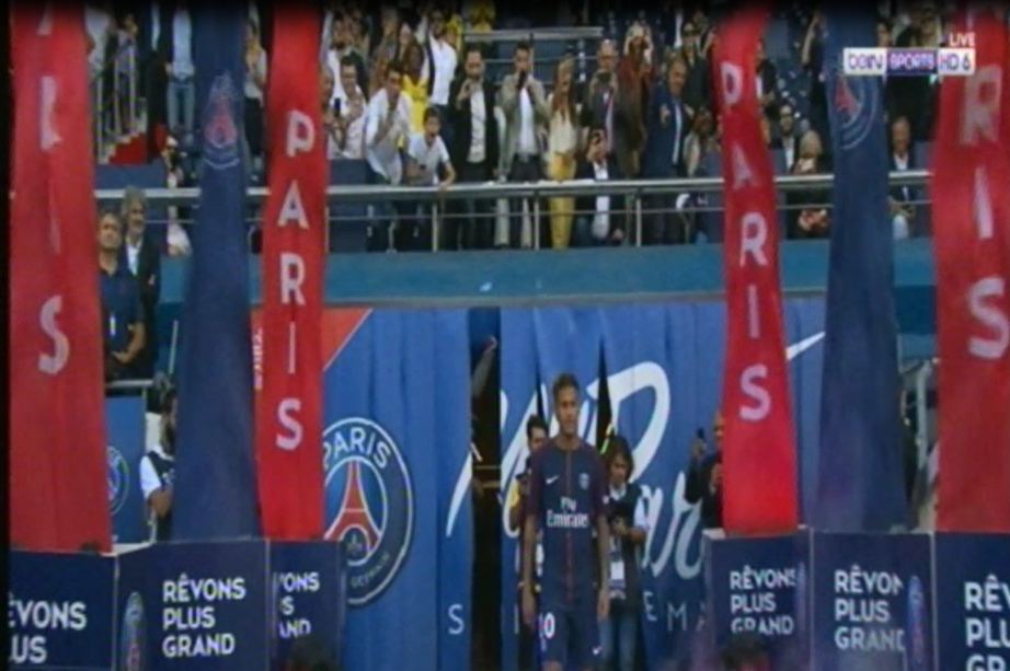 ومن بعده دخل نجم فريق باريس سان جيرمان والوافد الجديد البرازيلي نيمار دا سيلفا جونيور والذي لقى حفاوة كبيرة من جانب الجماهير بارض الملعب.