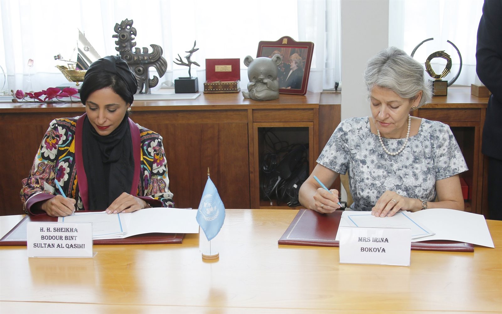 وقعت الشيخة بدور بنت سلطان القاسمي، مؤسس ورئيس جمعية الناشرين الإماراتيين، ورئيس اللجنة المنظمة لملف الشارقة العاصمة العالمية للكتاب، وإيرينا بوكوفا، المديرة العامة لمنظمة الأمم المتحدة للتربية والعلم والثقافة (اليونسكو)، مذكرة تفاهم لتعزيز التعاون في المجال الثقافي، وخصوصًا ما يتعلق بتنظيم الفعاليات التي تحتفي بالكتاب وتسهم بنشر القراءة.