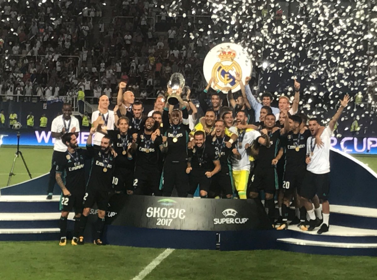 توج ريال مدريد الإسبانى بكأس السوبر الأوروبى لكرة القدم للمرة الرابعة فى تاريخه والثانية على التوالى بعدما حقق فوزًا صعبًا على نظيره مانشستر يونايتد الإنجليزى بهدفين مقابل هدف واحد فى المباراة التى أقيمت اليوم الثلاثاء على ملعب فيليب آرينا بالعاصمة المقدونية.