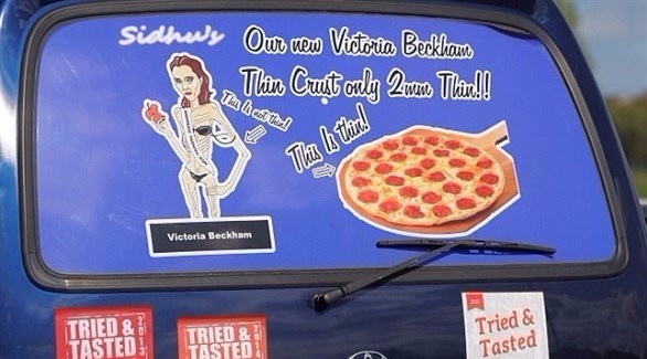 واستخدم مطعم سيدهو جولدن فيش آند شيبس في مدينة وولسيند بمنطقة نورث تينيسايد شرقي إنجلترا، رسمًا كاريكاتيريًا للمغنية ومصممة الأزياء فيكتوريا بيكهام مع عبارة "بيتزا فيكتوريا بيكهام الجديدة تتميز بعجينة رفيعة سمكها 2 ملليمتر فقط".