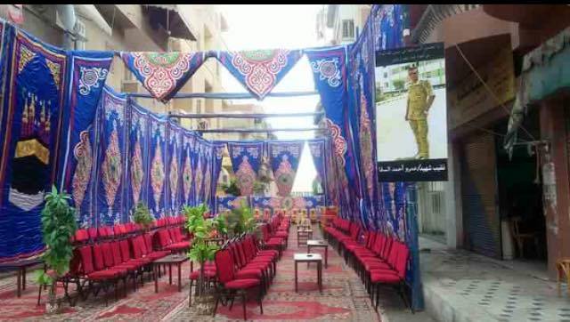 وترصد "صدى البلد " صور سرادق العزاء ، والذى تم وضع في مقدمته صورة للشهيد البطل الملازم أول " عمرو السقا" ومن المرتقب أن يتوجه المعزيون لتقديم واجب العزاء لعائلة الشهيد ، والذى تم دفنه بالفعل منذ قليل خلال جنازة عسكرية مهيبة كان يتقدمها اللواء عادل الغضبان محافظ بورسعيد ، واللواء أمجد عبد الفتاح مدير الأمن وقيادات الجيش ولفيف من قيادات الأمن والقيادات التنفيذية في المحافظة .